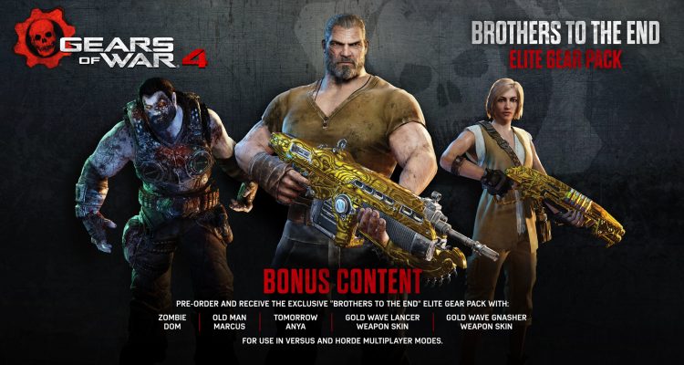 The Gears 4 pre-order bonuses have been revealed, courtesy of Microsoft, entitled the “Brothers to the End Elite Gear Pack.” The pre-order pack will be available to all versions of the game and will pay homage to the series’ legacy. Those who pre-order the game will receive three characters: Tomorrow Anya, Old Man Marcus, and Zombie Dom.